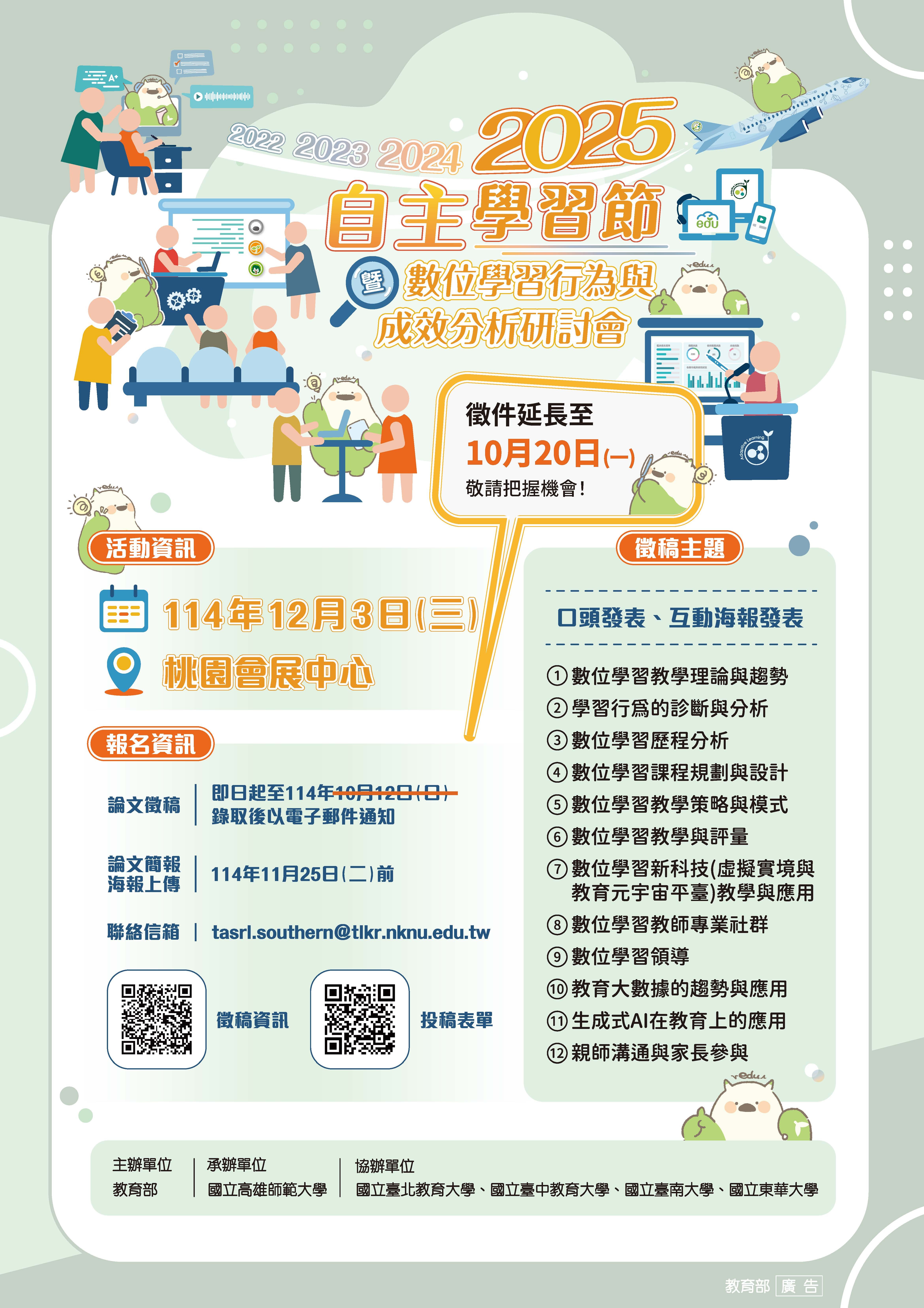 【轉知】高師大辦理「2025自主學習節暨數位學習行為與成效分析研討會」徵稿資訊,歡迎踴躍投稿