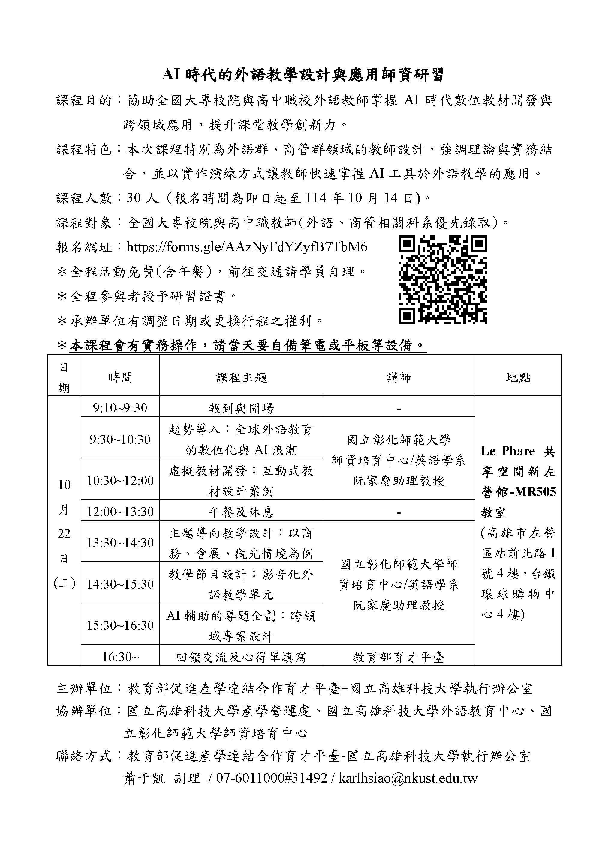 【轉知】高雄科技大學辦理「AI時代的外語教學設計與應用師資研習」,歡迎報名參加