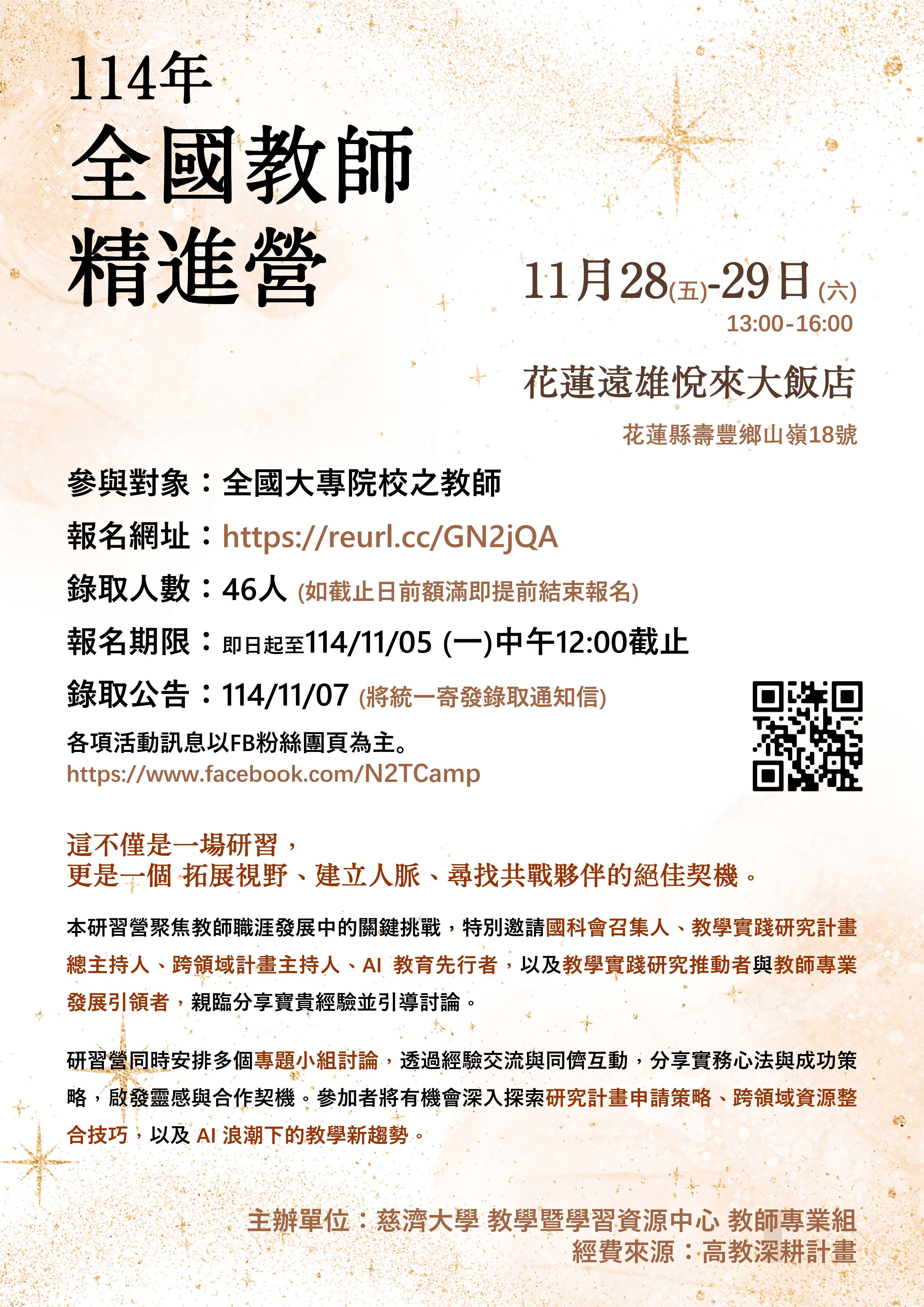 【轉知】慈濟大學教師發展暨教學資源中心舉辦「114年全國教師精進營」,歡迎報名參加