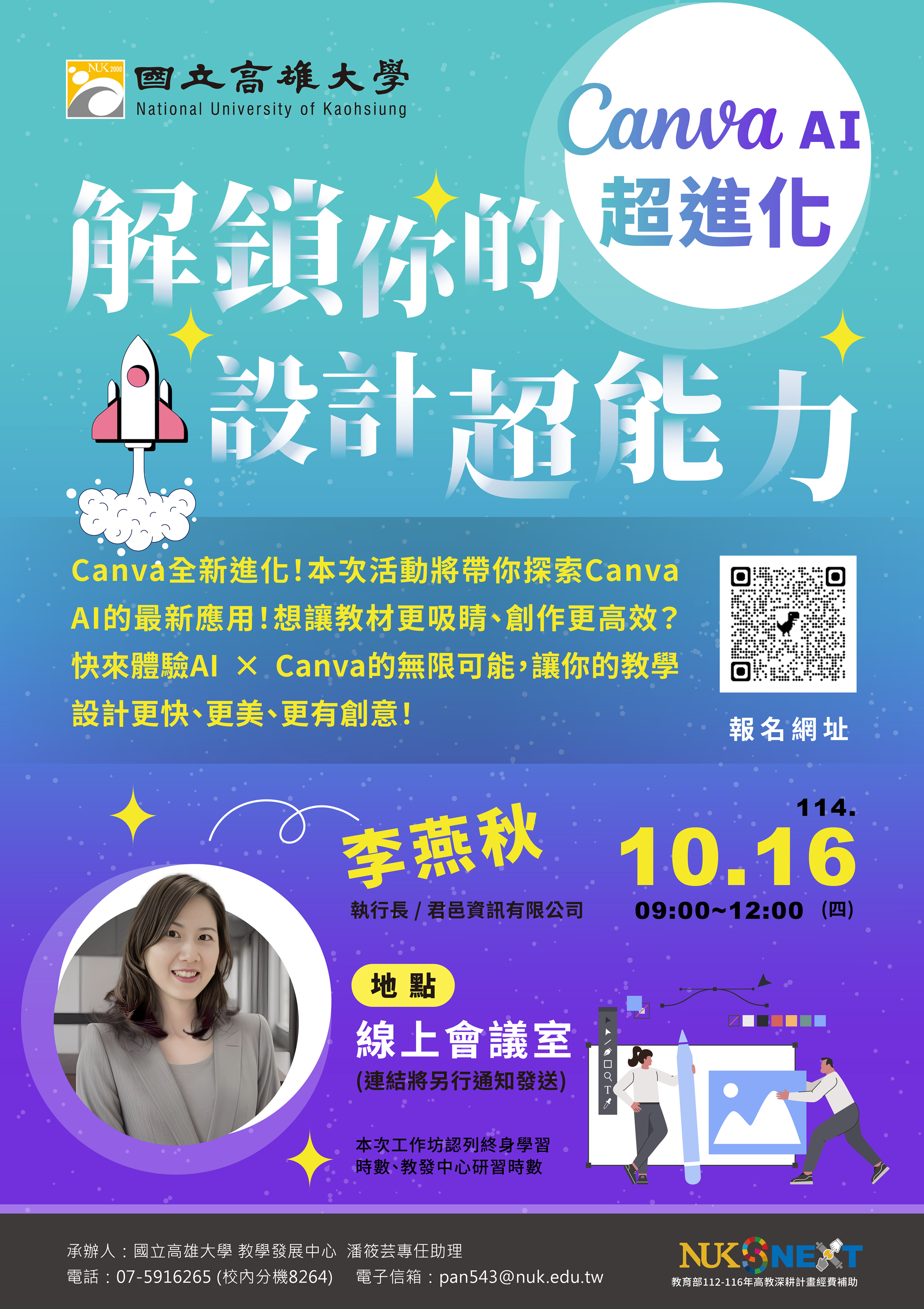 聯絡人:高雄大學教學發展中心潘小姐,電話(07)591-6265(分機8264),Email:pan543@nuk.edu.tw