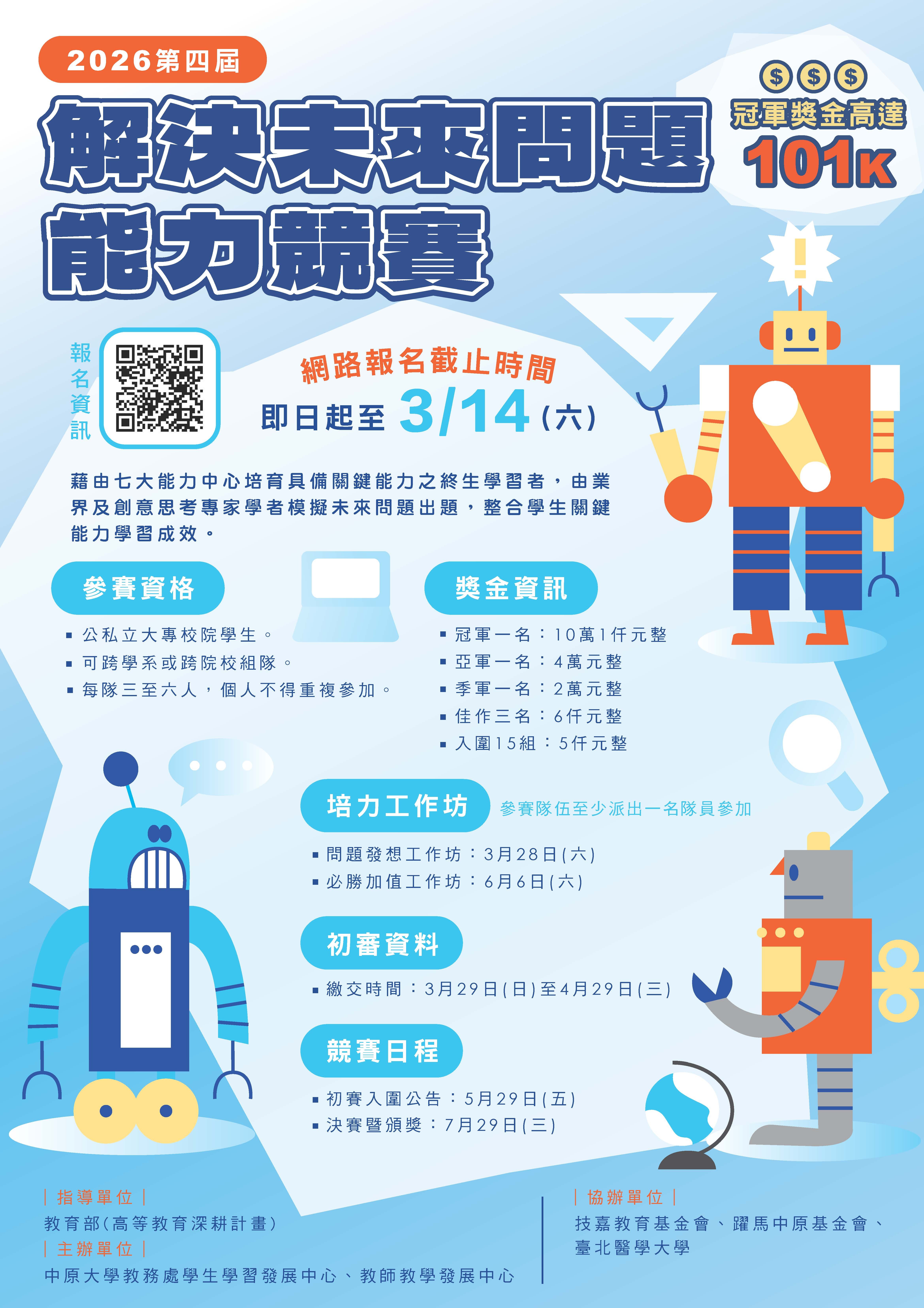 【轉知】中原大學教務處學生學習發展中心舉辦第四屆「解決未來問題能力競賽」,歡迎報名參加